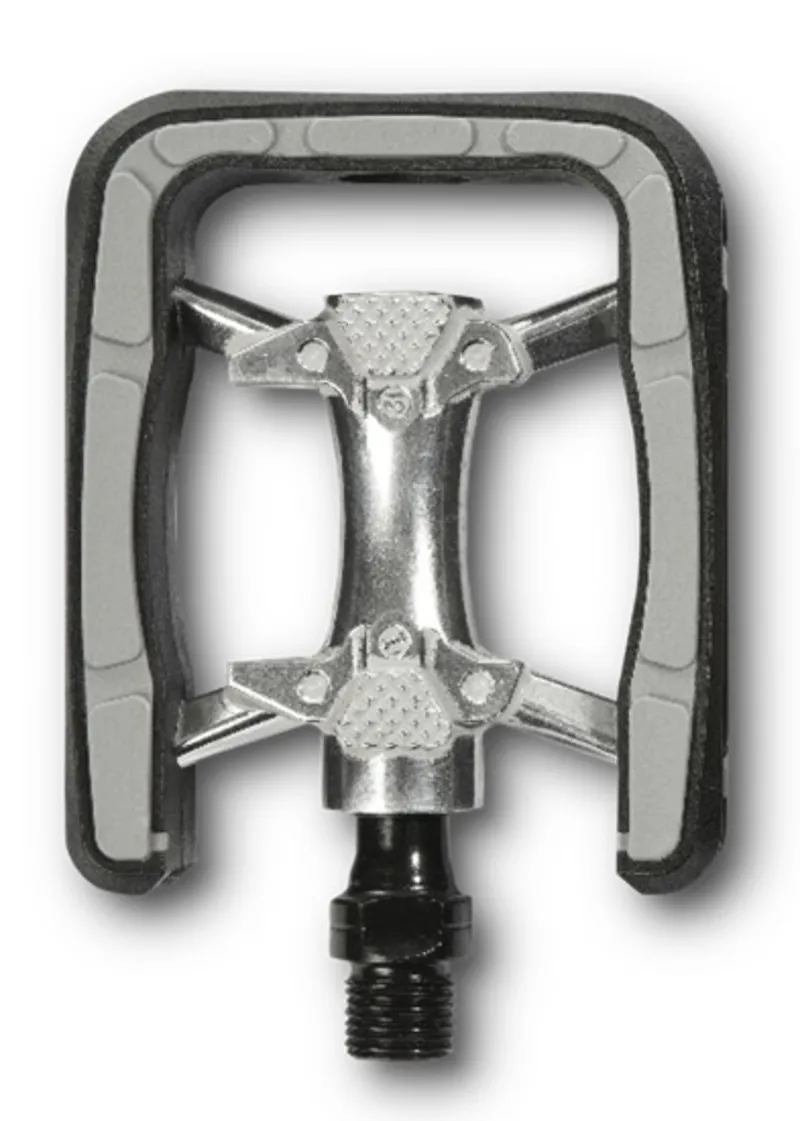 Industrial-bearing comfort pedal with non-slip Kraton overlay, Cr-Mo axle for long life, integrated reflectors.